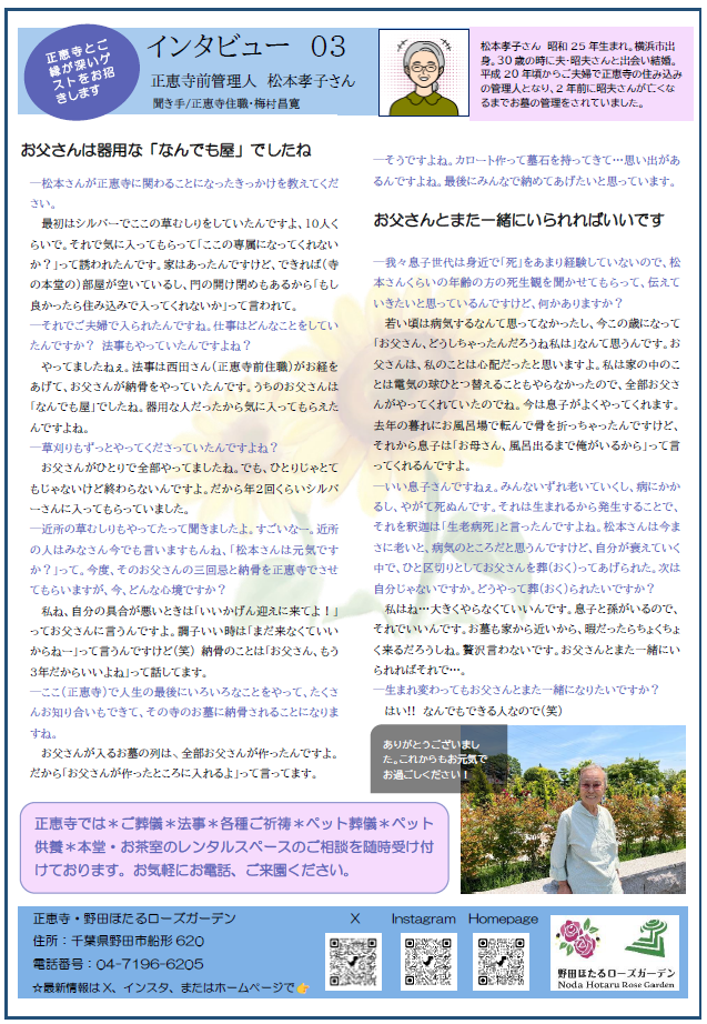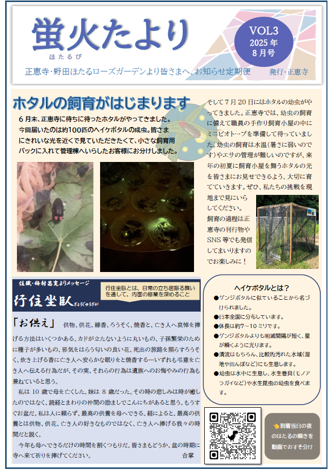 野田ほたるローズガーデン , 正恵寺 蛍火たより 2025年8月 2025.08.08 野田ほたるローズガーデン , 正恵寺 Post 記事のタイトルとURLをコピーする 蛍火たより 2025年7月 前の記事 蛍火たより 2025年9月 次の記事 関連記事 野田ほたるローズガーデン・正恵寺ブログをはじめました 2024.09.05 蛍火たより 2025年11月 2025.11.10 野田ほたるローズガーデン見学ご希望の方へ 2024.09.05 正恵寺 住職 梅村昌寛から皆様へ 2024.09.05 【送迎車・車椅子】のご用意ができました 2025.06.01 蛍火たより 2025年6月 2025.07.02 蛍火たより 2025年7月 2025.07.02 野田ほたるローズガーデンの薔薇(バラ)が満開の季節になりました 2025.05.30 コメント コメントは利用できません。 トラックバック ( 0 ) この記事へのトラックバックはありません。 トラックバックURL 返信をキャンセルする。 名前(例:山田 太郎) ( 必須 ) E-MAIL ( 必須 ) - 公開されません - URL 上に表示された文字を入力してください。 コメントを書く