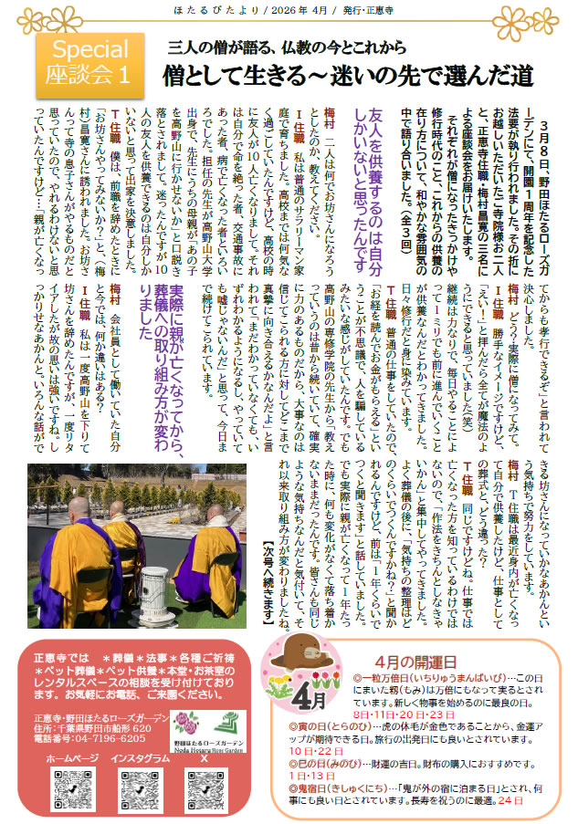 野田ほたるローズガーデン , 正恵寺 蛍火たより 2026年4月 2026.04.09 野田ほたるローズガーデン , 正恵寺 Post 記事のタイトルとURLをコピーする 蛍火たより 2026年3月 前の記事 関連記事 蛍火たより 2026年3月 2026.03.16 蛍火たより 2025年7月 2025.07.02 蛍火たより 2025年10月 2025.10.07 蛍火たより 2025年11月 2025.11.10 蛍火たより 2025年12月 2025.12.11 蛍火たより 2026年2月 2026.02.07 蛍火たより 2025年6月 2025.07.02 蛍火たより 2025年9月 2025.09.09 コメント コメントは利用できません。 トラックバック ( 0 ) この記事へのトラックバックはありません。 トラックバックURL 返信をキャンセルする。 名前(例:山田 太郎) ( 必須 ) E-MAIL ( 必須 ) - 公開されません - URL 上に表示された文字を入力してください。 コメントを書く